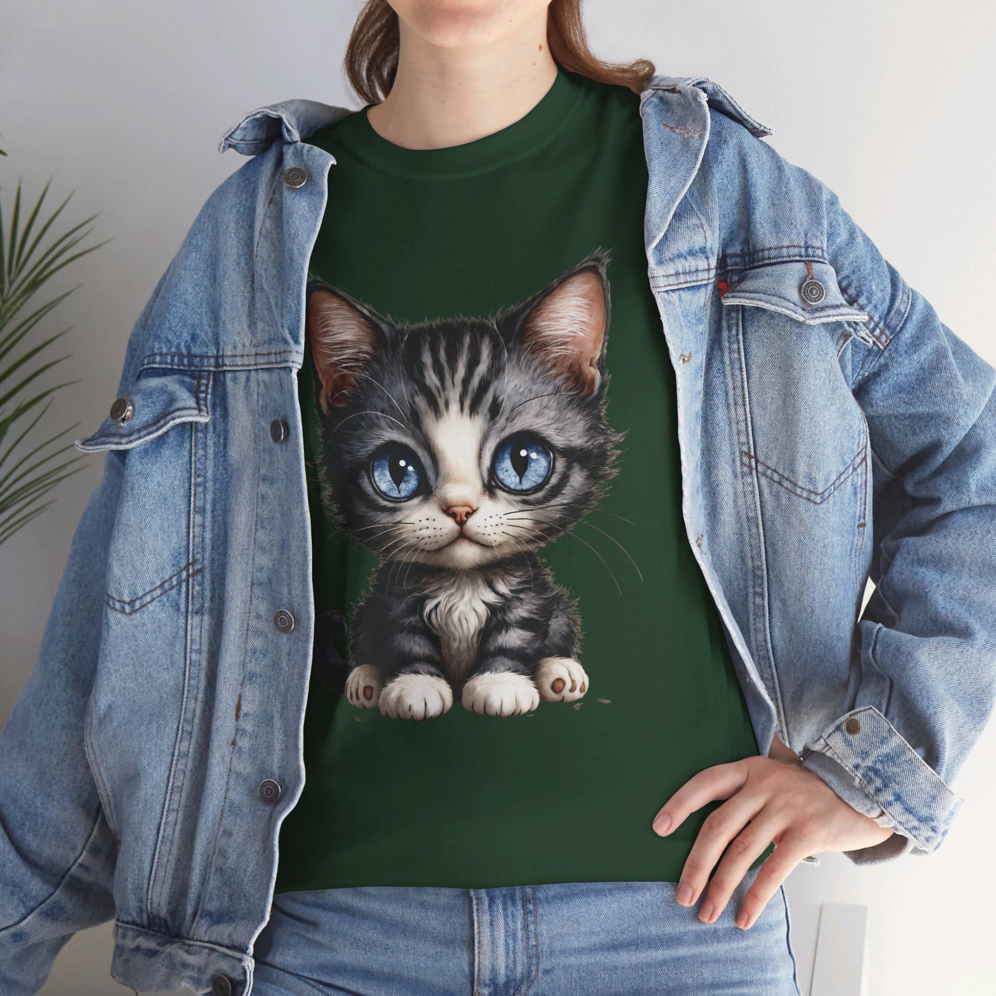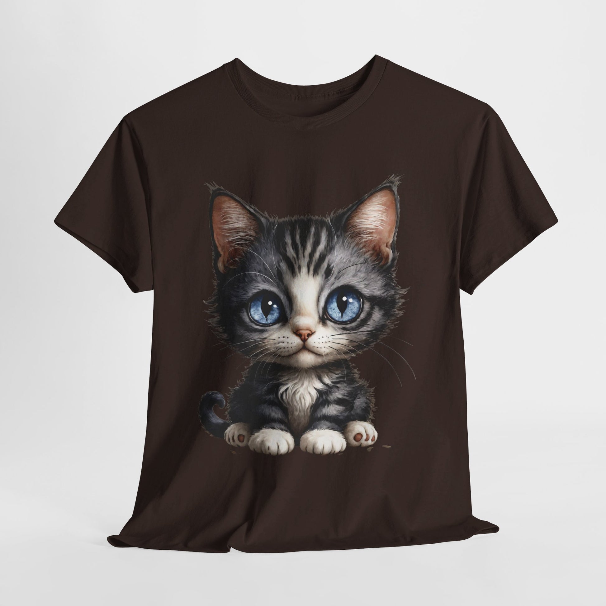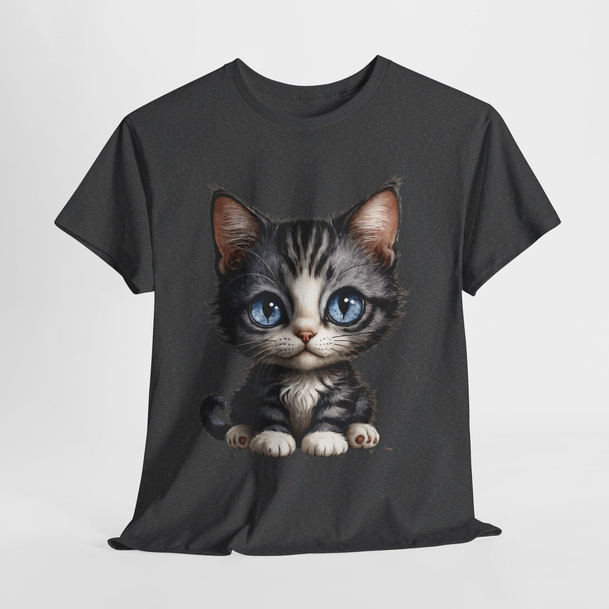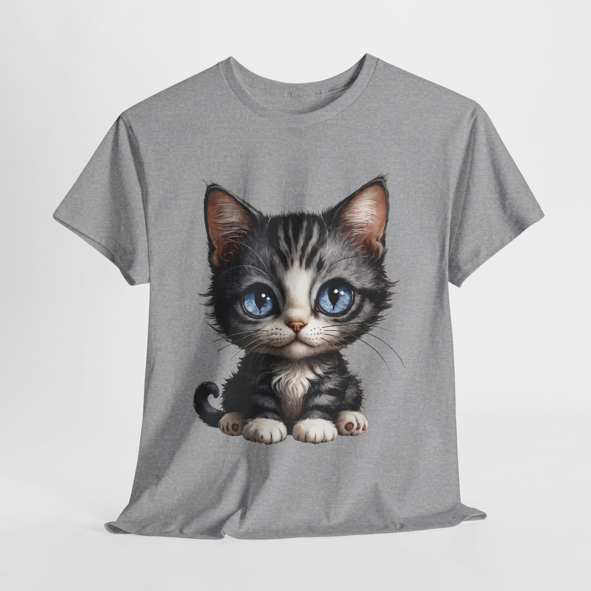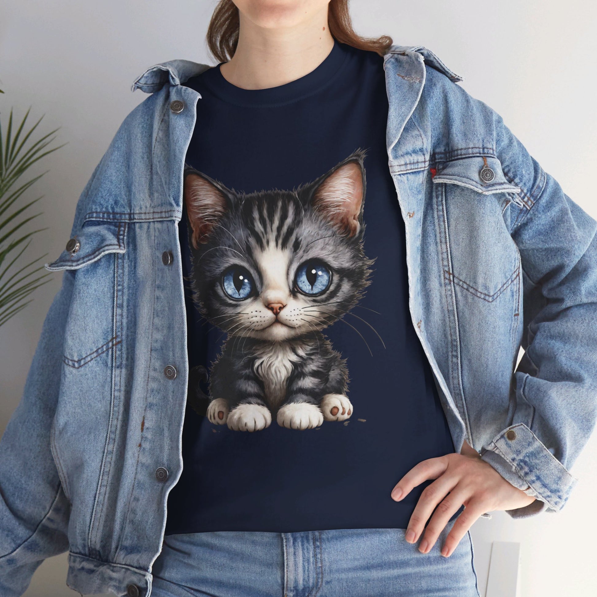 Adorable T-Shirt featuring a cute kitten with blue eyes, perfect for cat lovers. The classic fit and comfy feel make it suitable for everyday wear. Ideal for casual outings, lounging at home, or as a thoughtful gift for someone special.