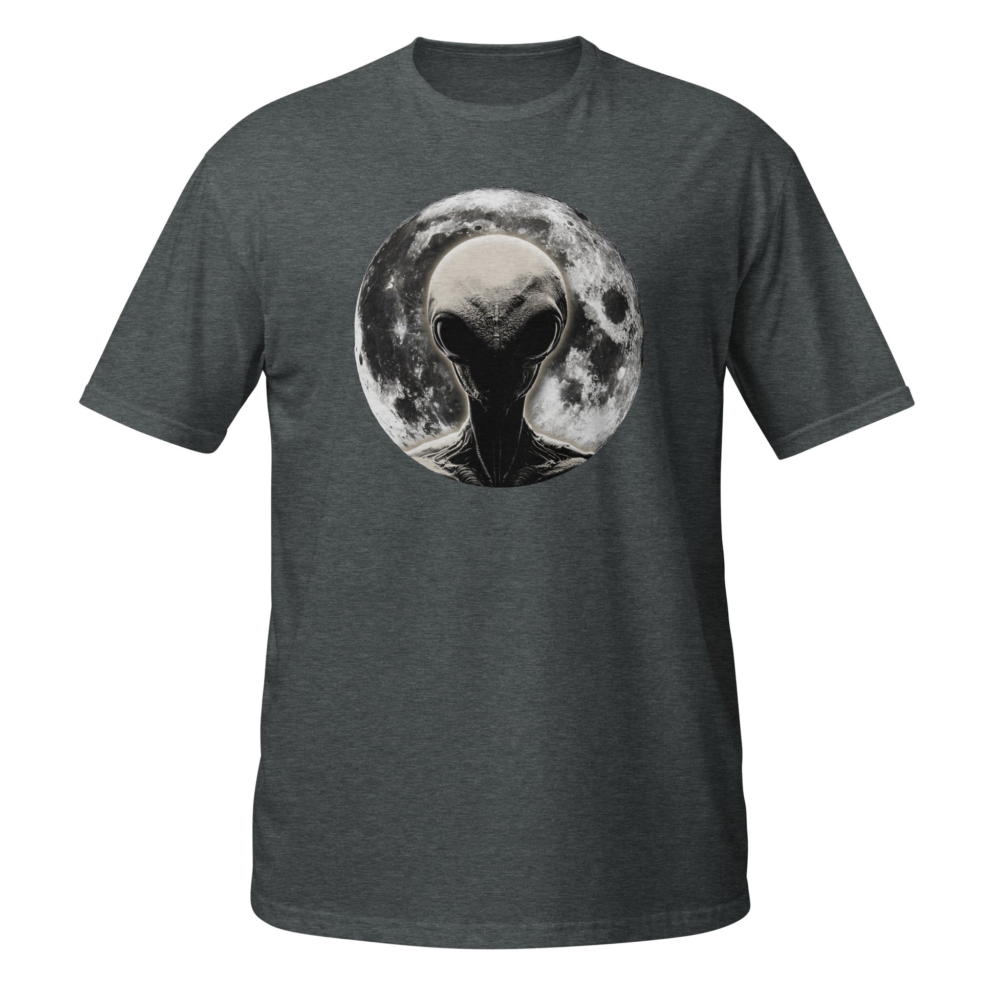 Cooles Motiv eines Aliens vor dem Mond. Dieses Motiv ist ein tolles Statement und zeigt, dass du dich für das Thema UFO, UAP, Alien, die Grey oder den Weltraum interessierst.