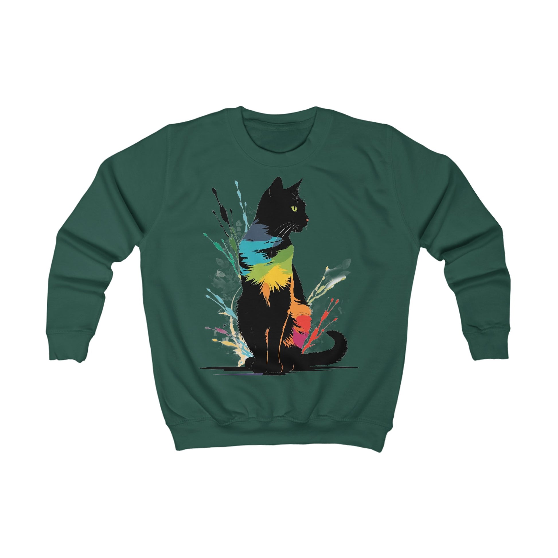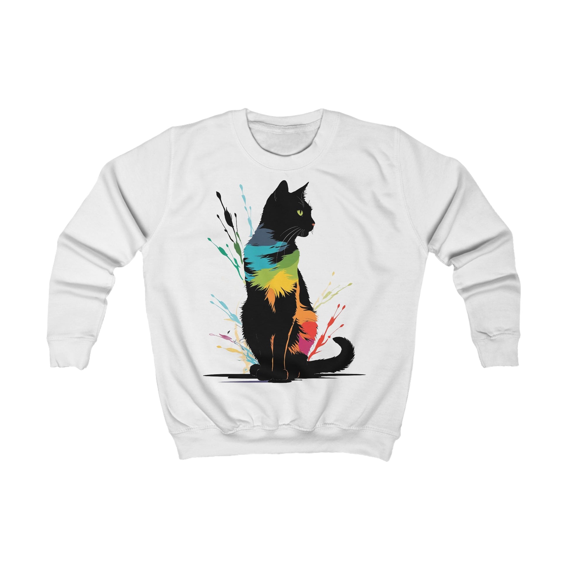 This Kids Sweatshirt features a playful design of a Black Cat with Paint splashes, creating a fun and whimsical vibe. Perfect for children who love cats and enjoy unique, artistic designs. Ideal for Halloween, cat lovers, or animal-themed celebrations.