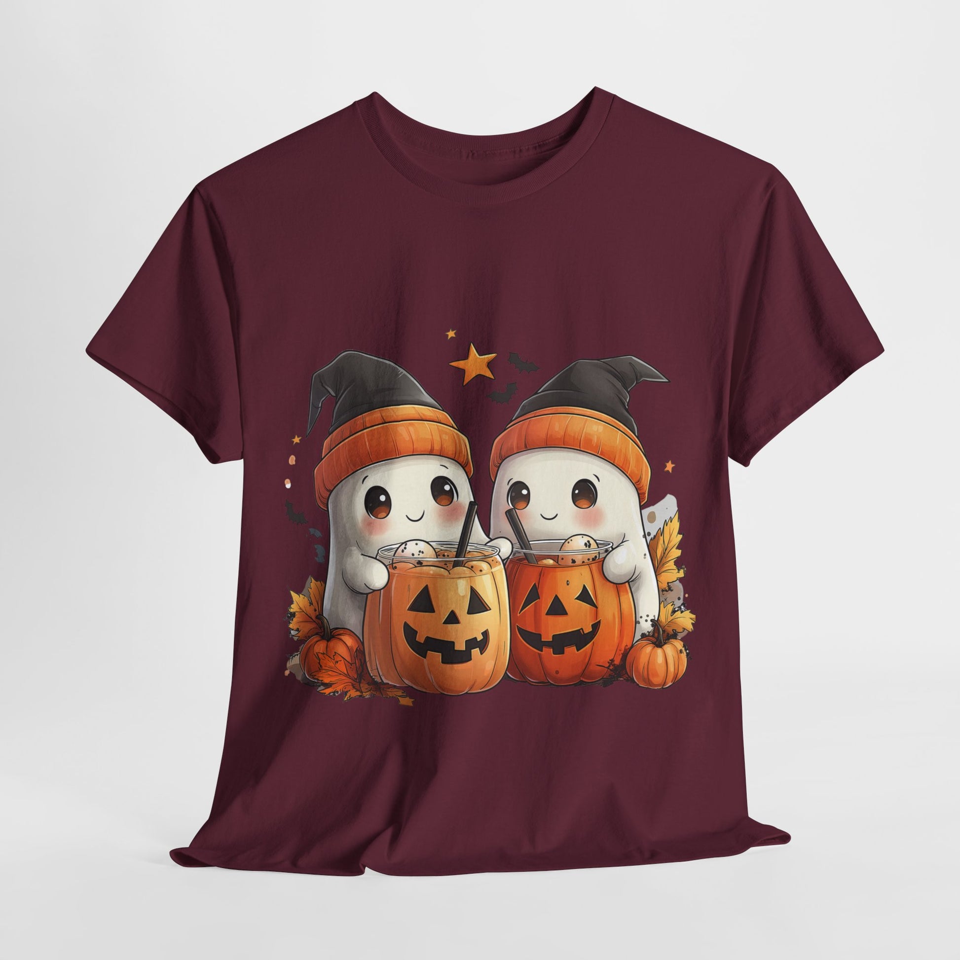 A cute ghost design featuring an orange beanie with black stars, perfect for Halloween celebrations. This unisex heavy cotton tee offers a comfortable fit with a classic silhouette that can be worn casually or semi-formally. Ideal for those looking for a playful and festive addition to their wardrobe during the spooky season.