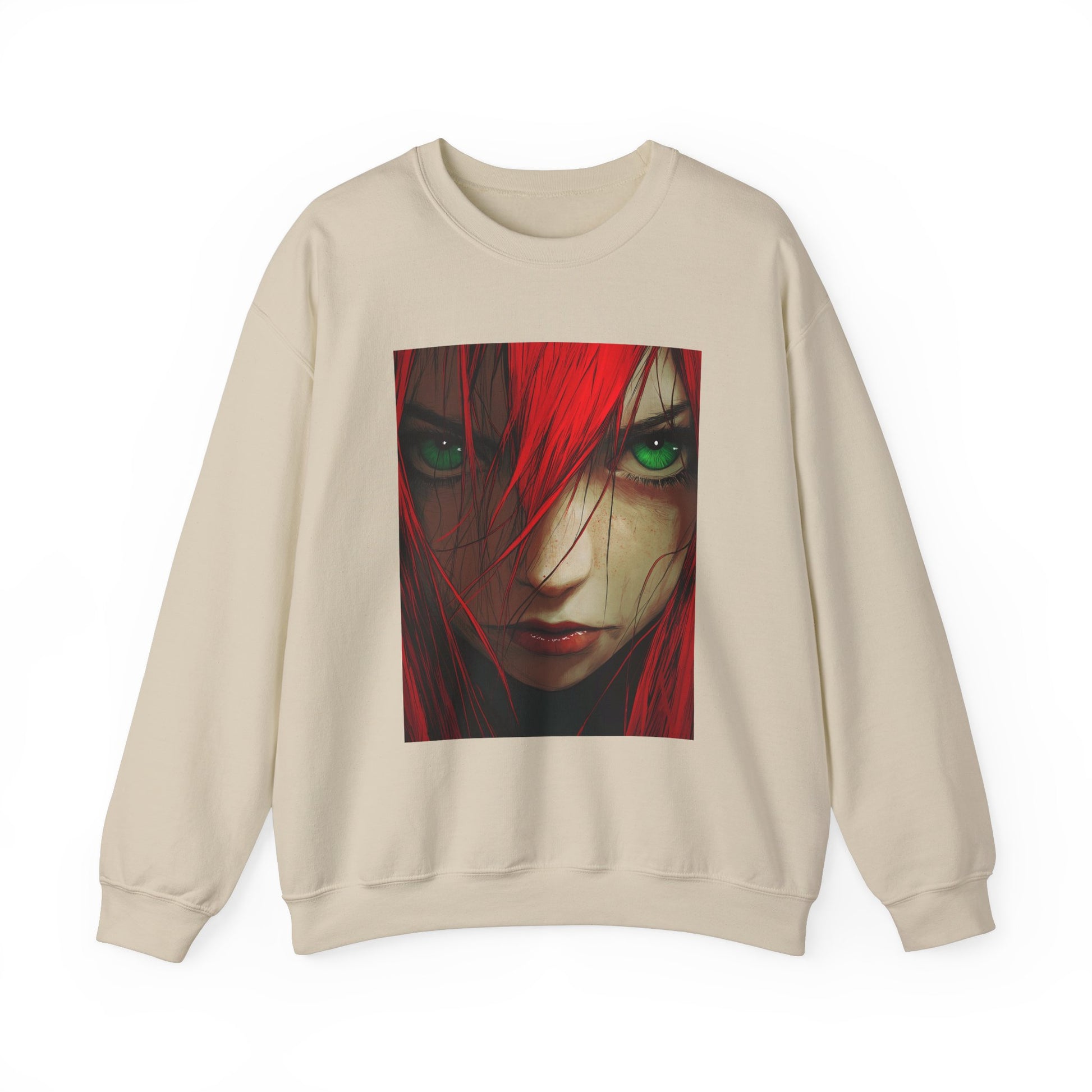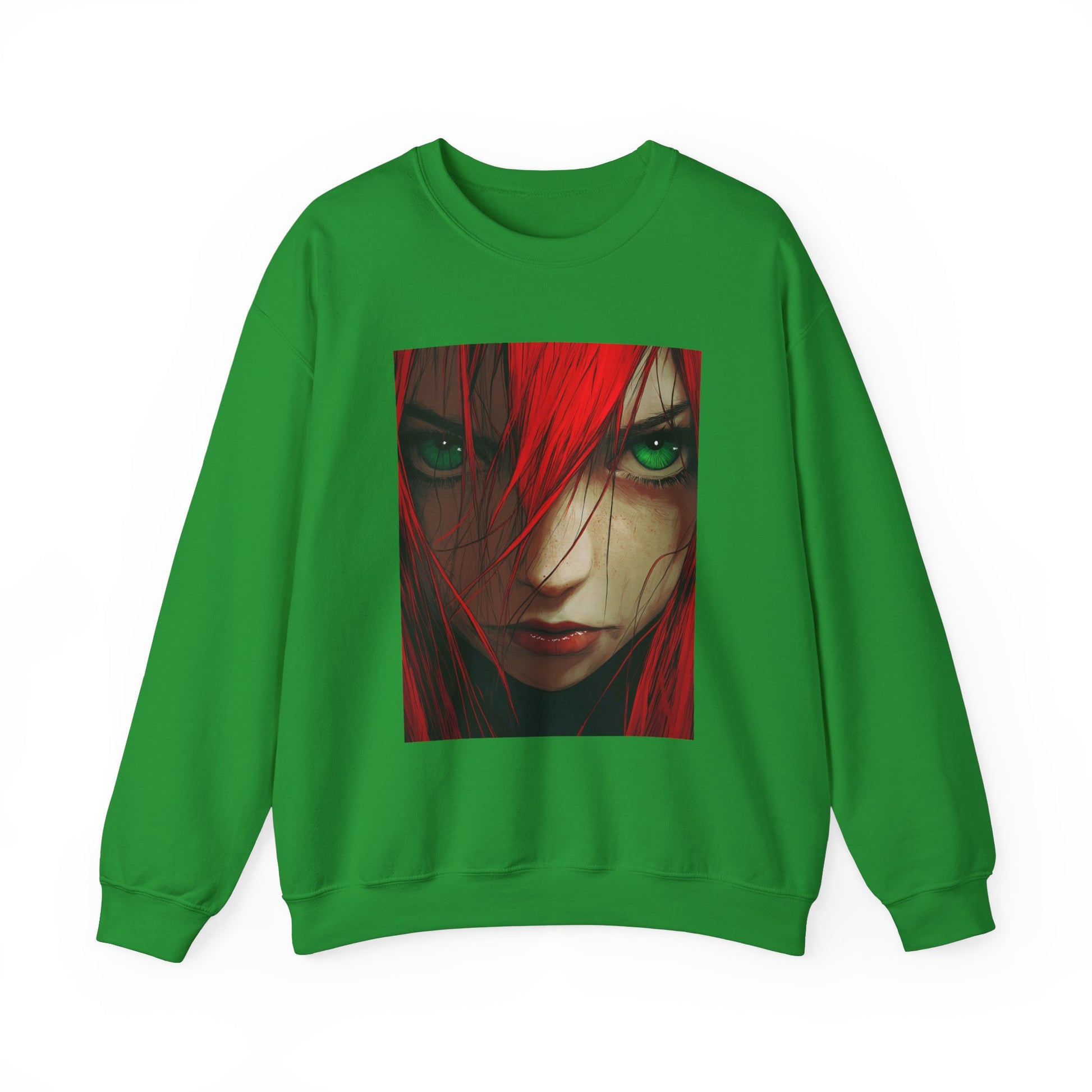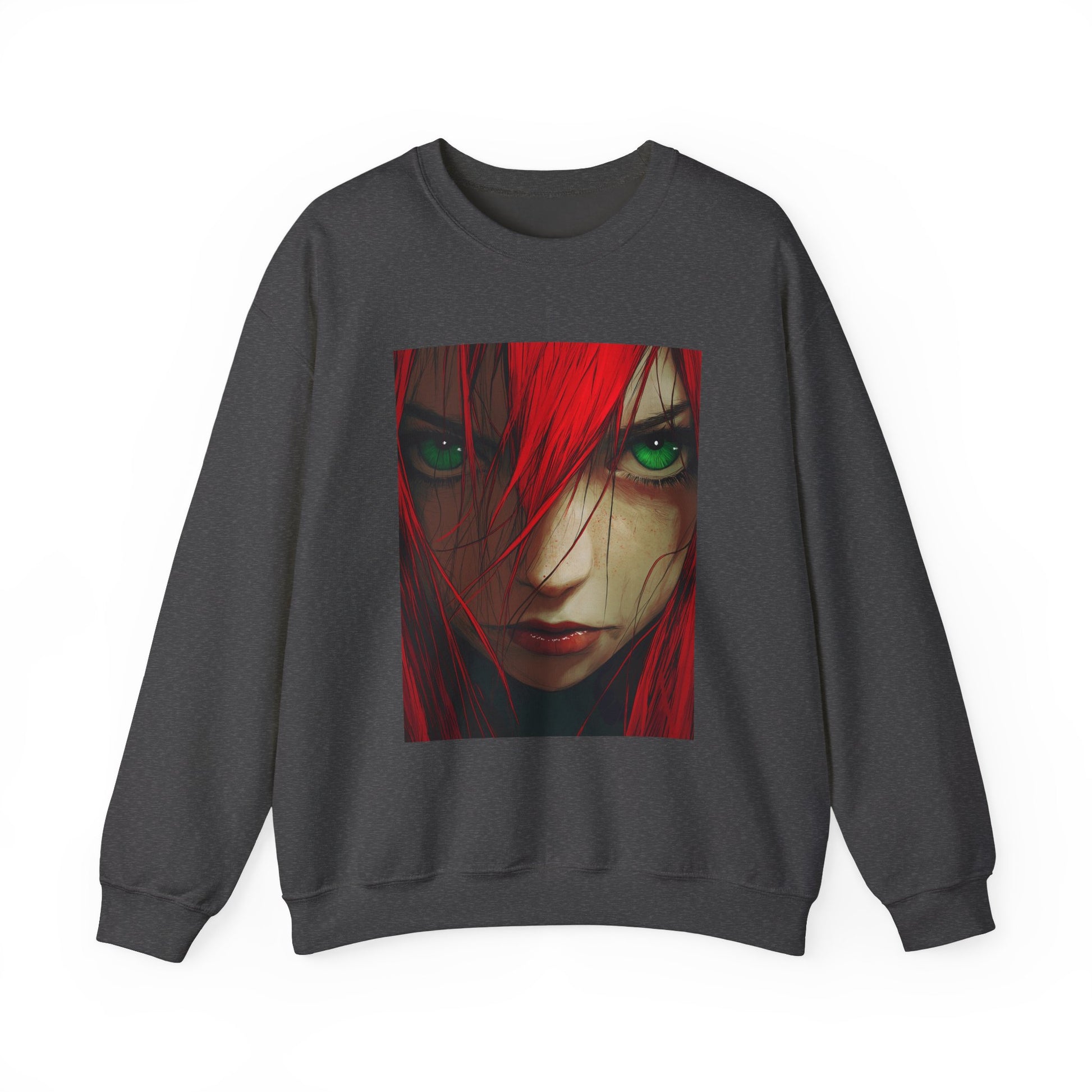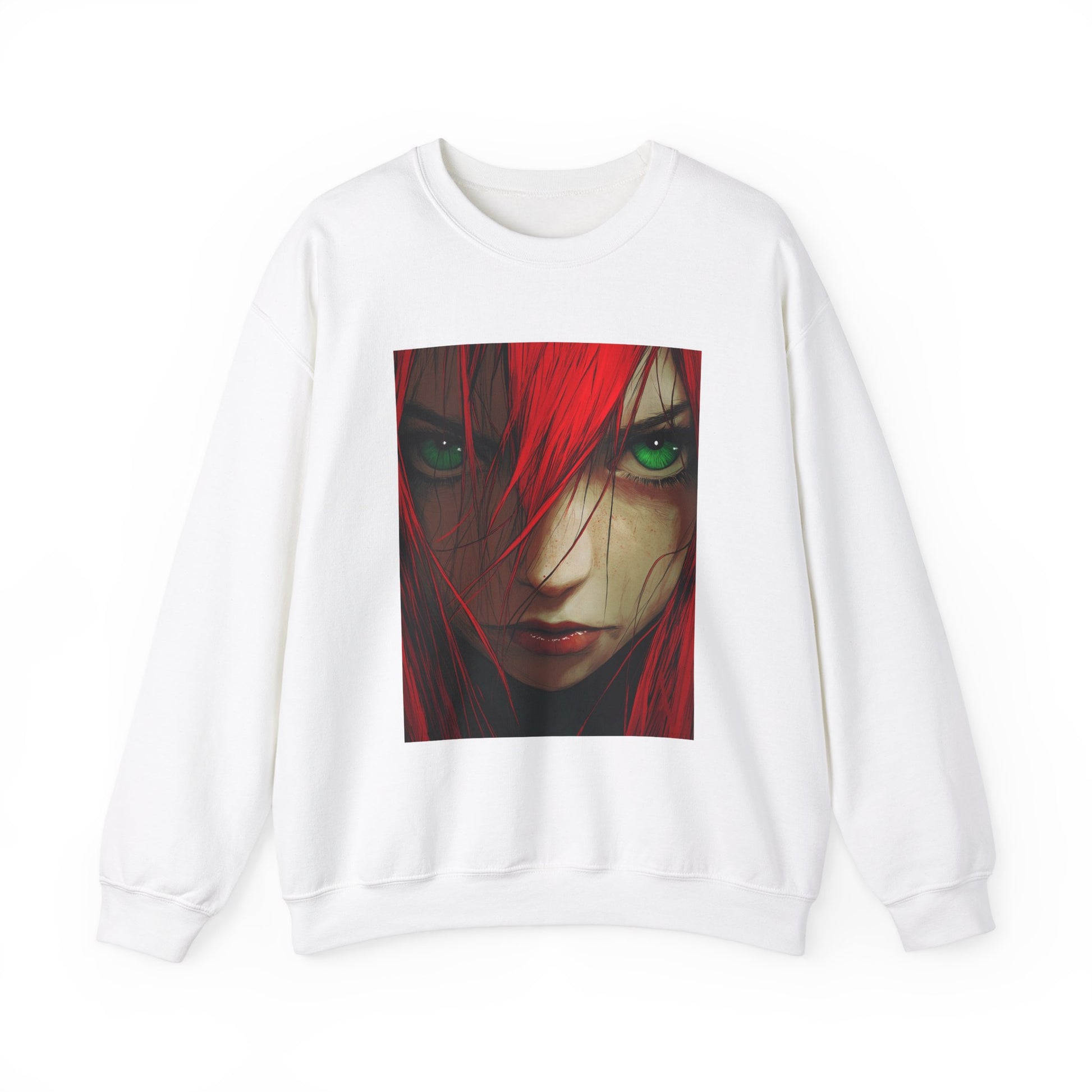 Red-Haired Anime Woman Crewneck Sweatshirt, Manga Style, Japanese Anime Gift, Green Eyed Anime Character, Asian Cartoon Apparel, Anime Fan